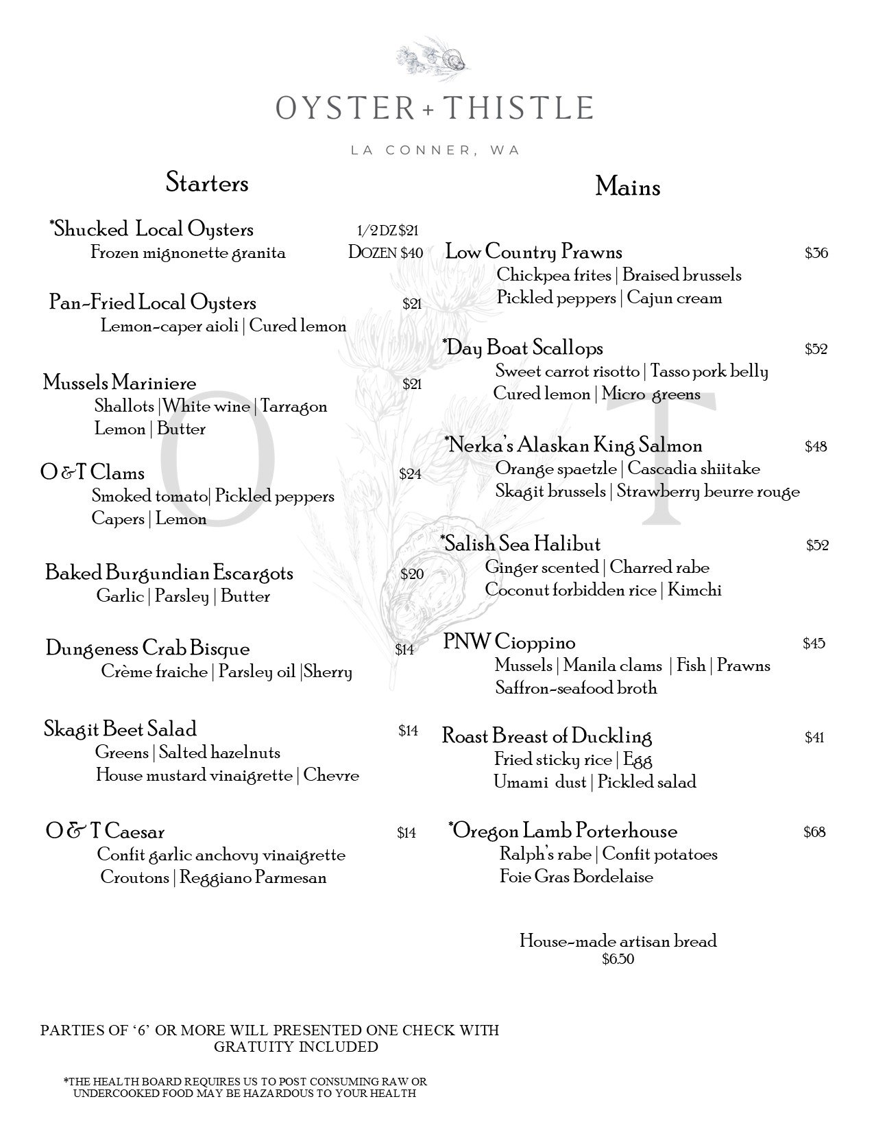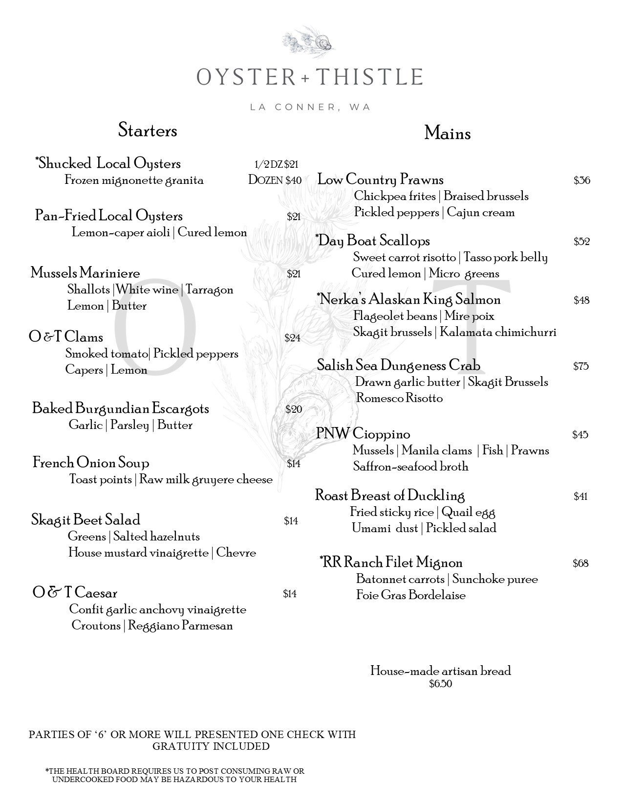 Oyster and Thistle presents food that aims to celebrate our bountiful Skagit Valley with each and every changing season. From oysters to oxtails, brussel sprouts to strawberries, we are honored and delighted to support and serve our local farms.