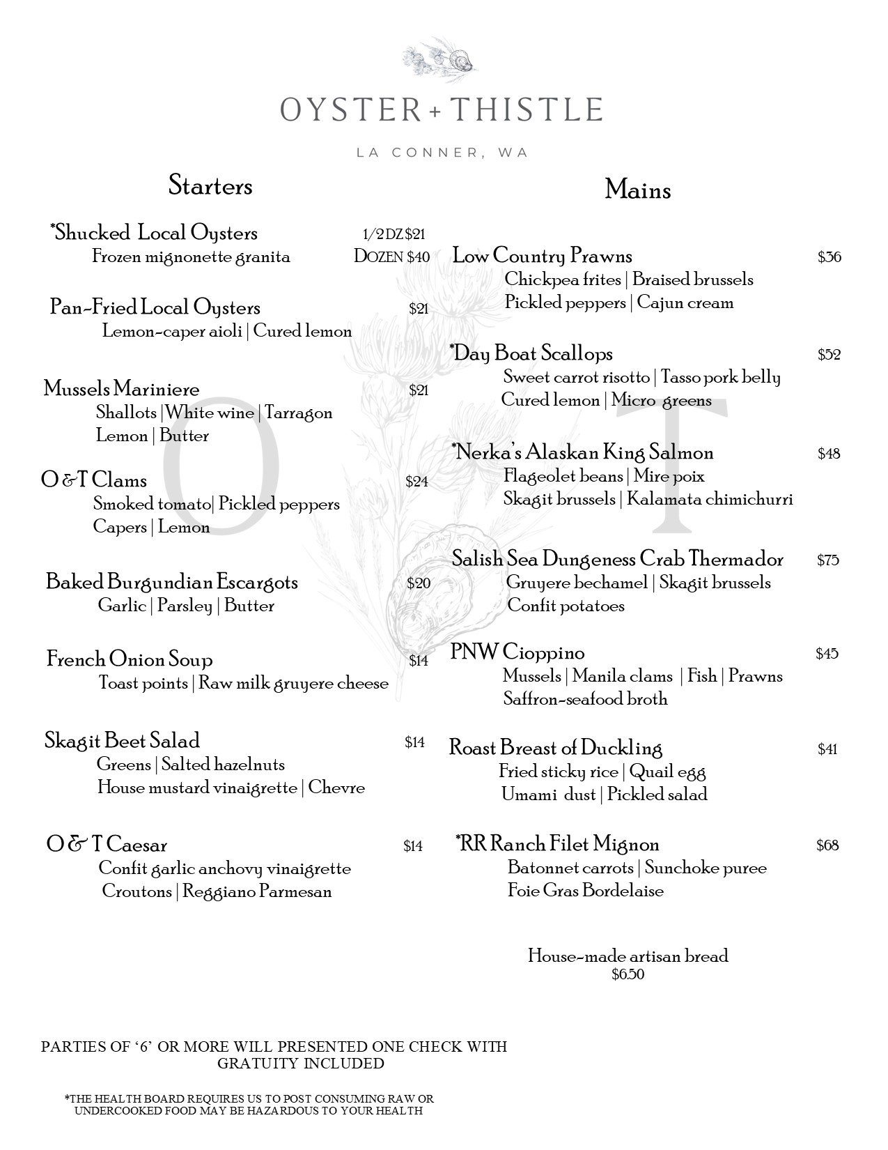 Oyster and Thistle presents food that aims to celebrate our bountiful Skagit Valley with each and every changing season. From oysters to oxtails, brussel sprouts to strawberries, we are honored and delighted to support and serve our local farms.